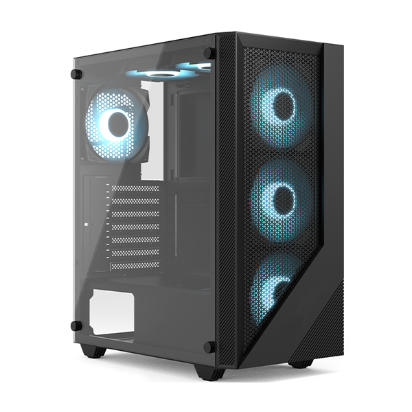 Model: 2603, Motherboard Support: ATX / M-ATX / ITX, Feature of front Panel: Iron Mesh, Side Panel: Tempered Glass, Pre-Install Fans: 3*120mm Fixed RGB Fans, Ports: USB3.0x1; USB 2.0x2+HD AUDIO+MICx1